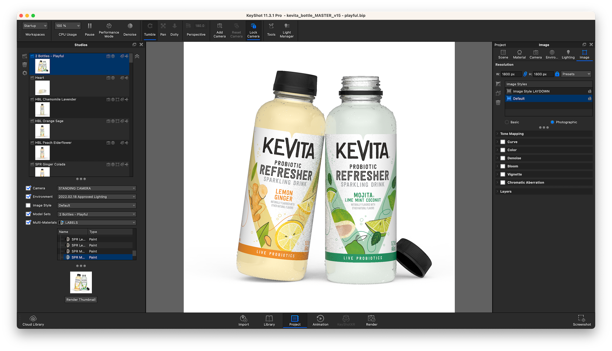 3D Modeling & Rendering RXBAR Layers RXBAR Family Shot Round Barn Cocktails Wireframe View Solid View Final Render KeVita Bottle Renders Wireframe View Solid View with xRay Solid with Droplets Final Blender Render