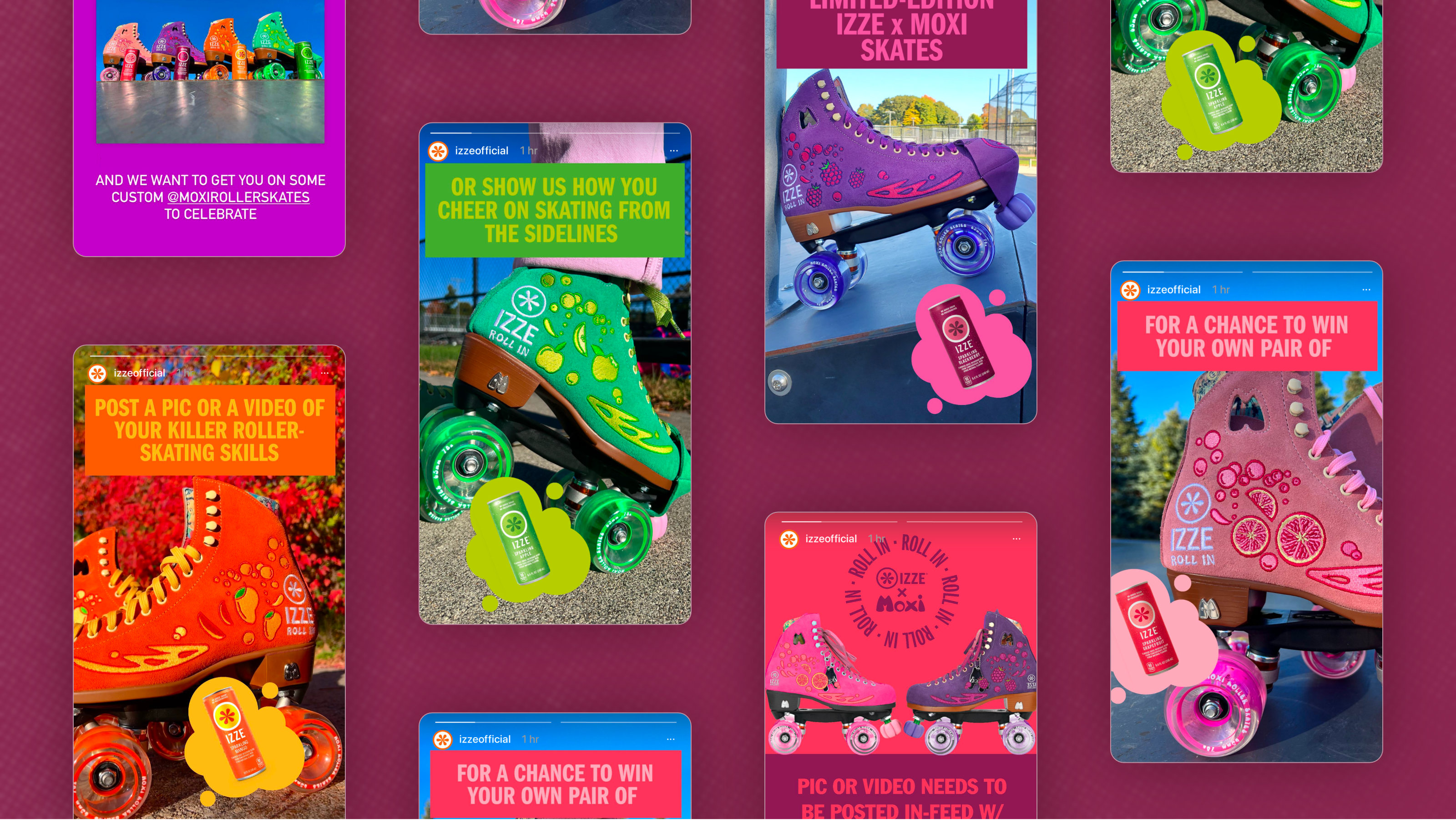 A “fizzing awesome” collab/event between IZZE & Moxi Skates. The initial design sprint was completed in-house with final execution handed off to a social agency partner.