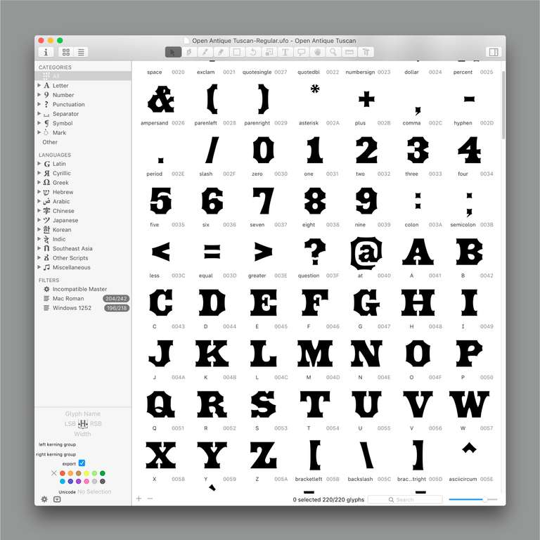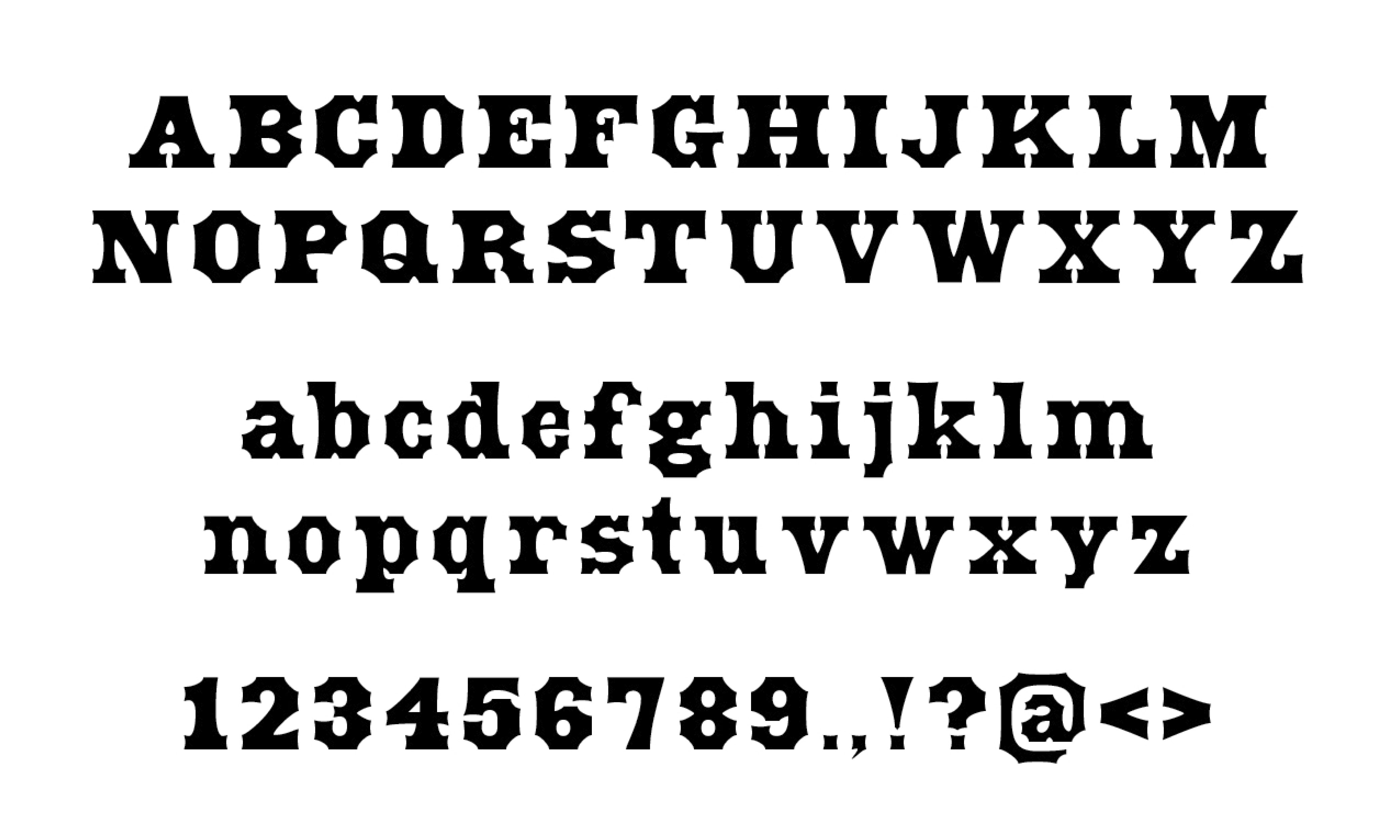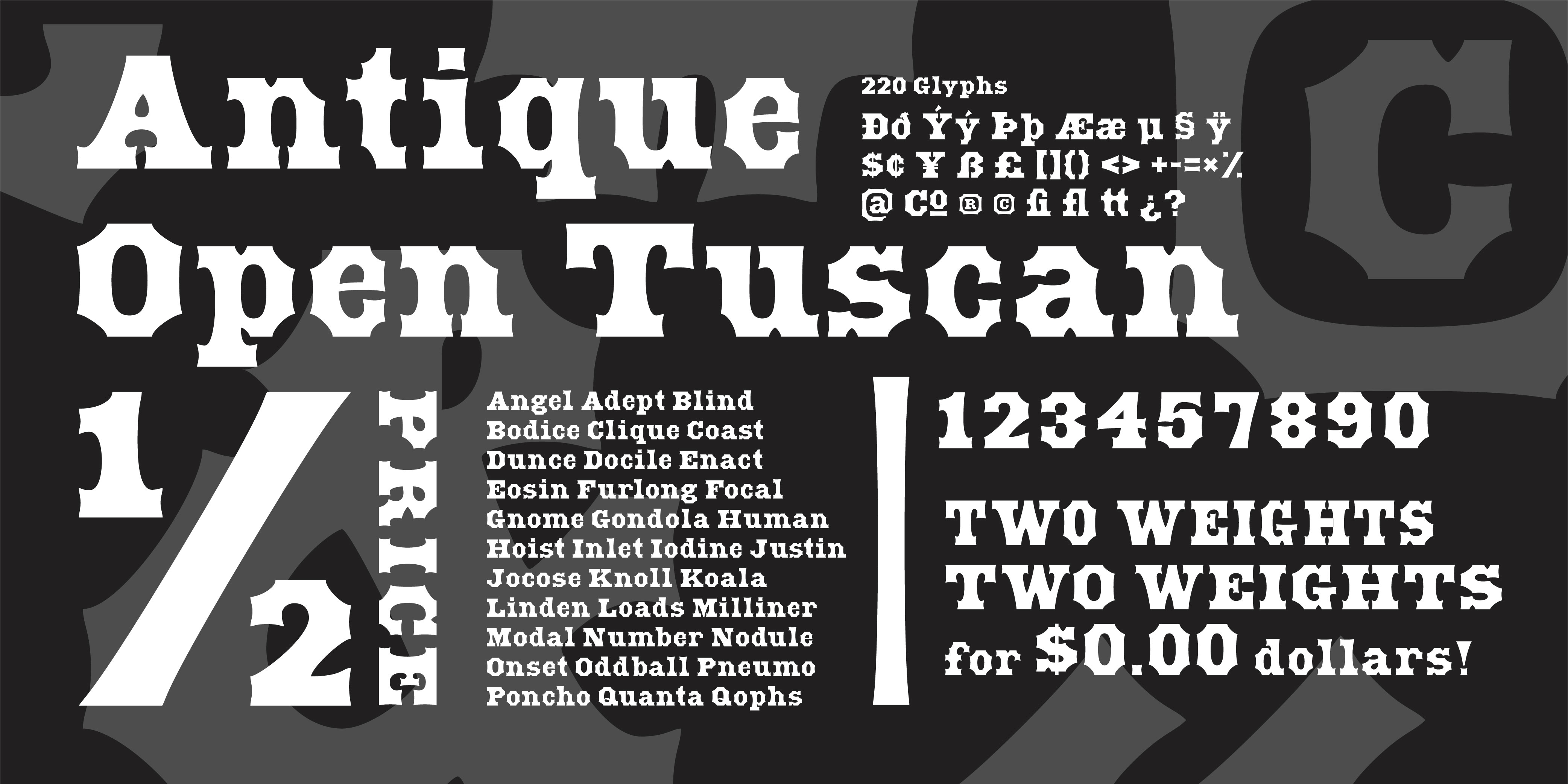 Open Antique Tuscan is a revival and expansion of an Antique Tuscan wood type design Wells & Webb 1849 specimens catalog. This was inspired by the book "American Wood Type 1828–1900" by Rob Roy Kelly.